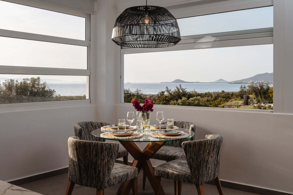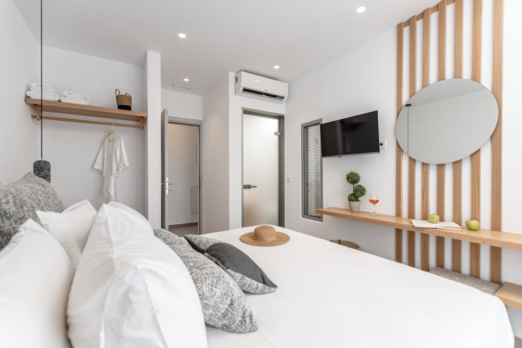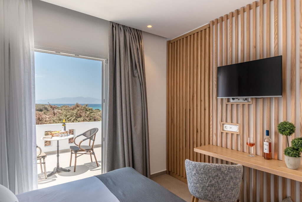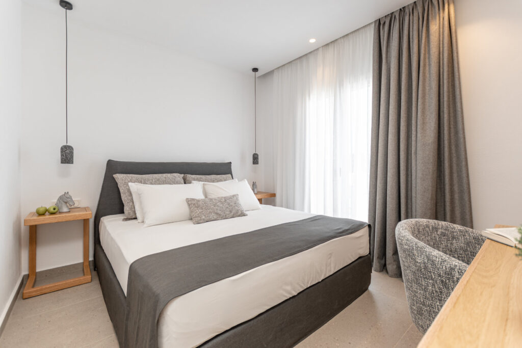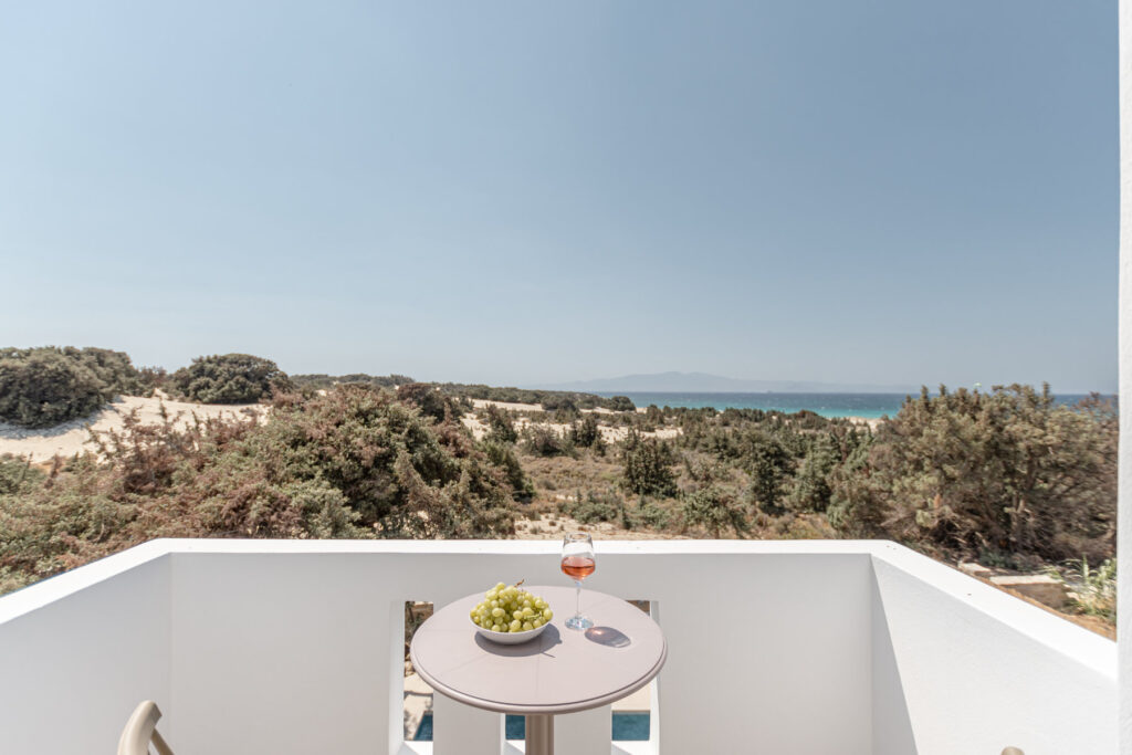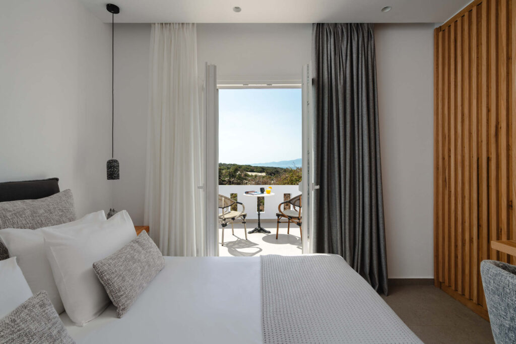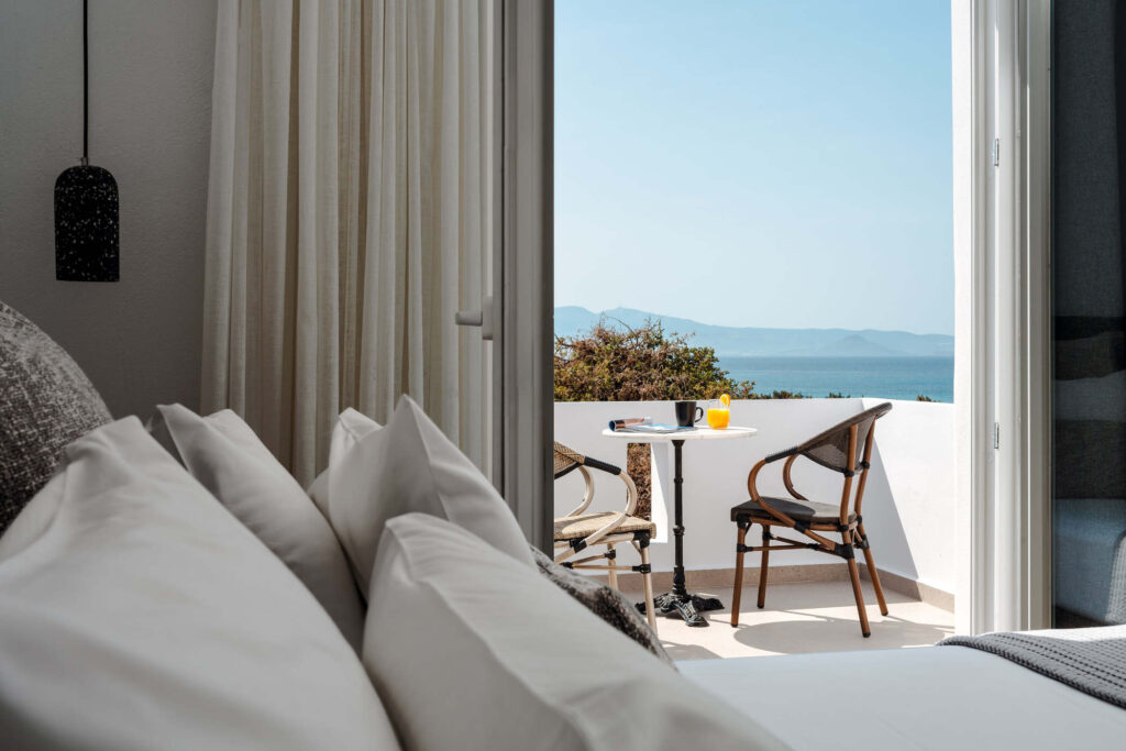 Each bedroom features a king-size bed, en-suite bathroom, satellite TV, desk, and air conditioning, ensuring a restful and carefree stay. Step onto your private balcony and take in serene views of the Aegean Sea, where the rhythm of the waves sets the perfect tone for relaxation.