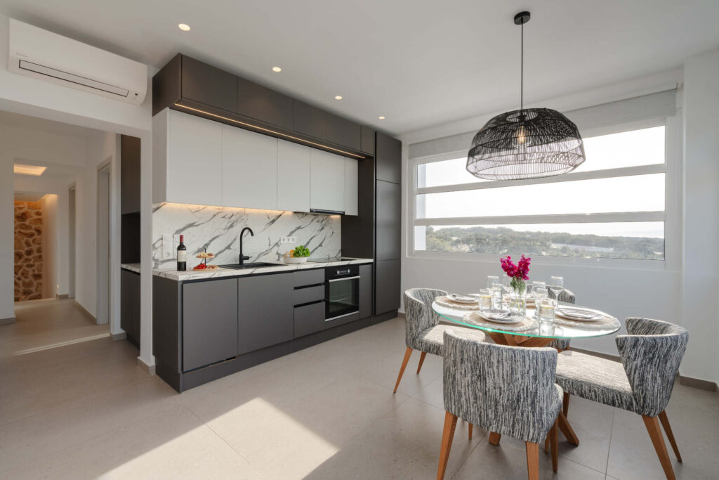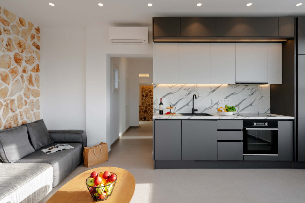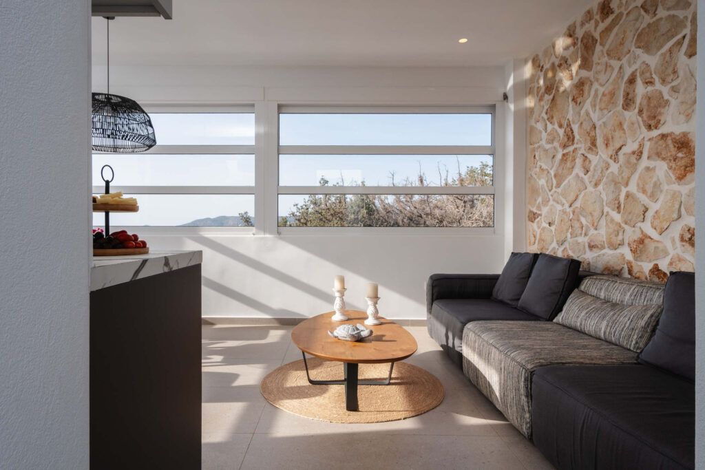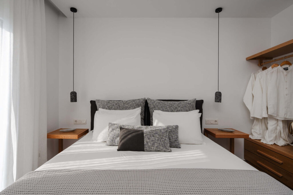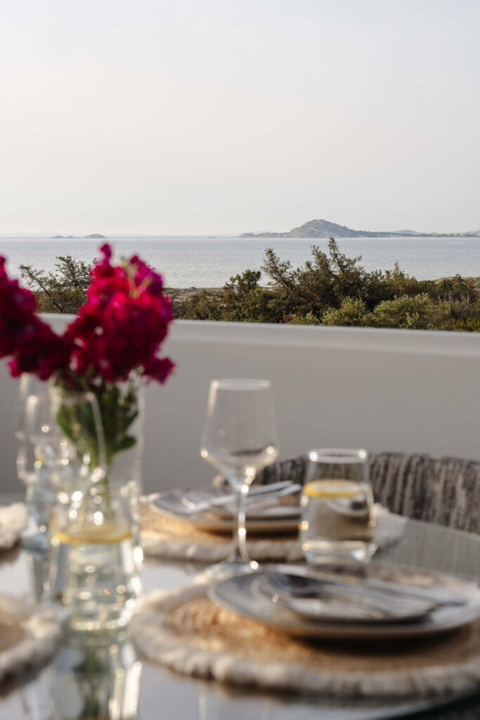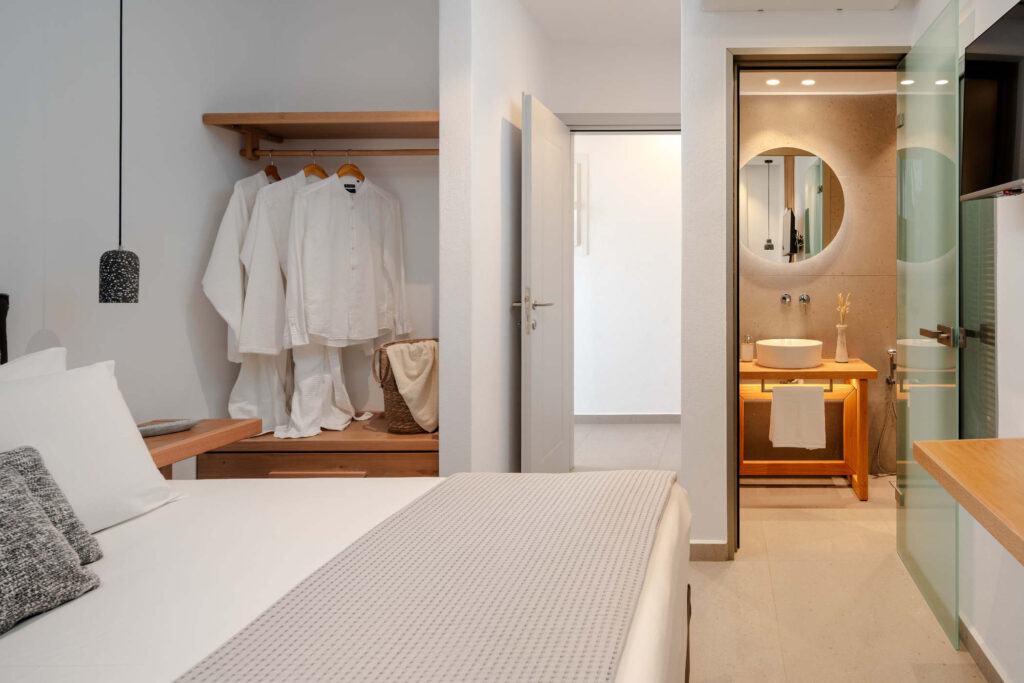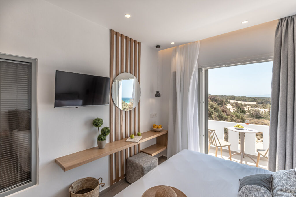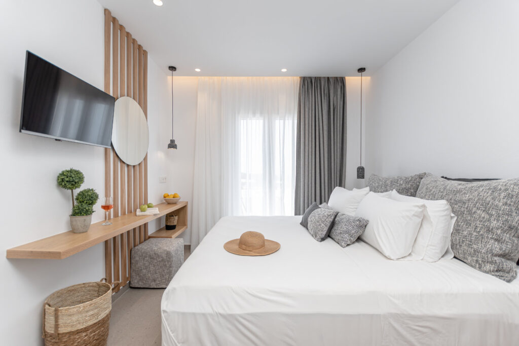 Each bedroom features a king-size bed, en-suite bathroom, satellite TV, desk, and air conditioning, ensuring a restful and carefree stay. Step onto your private balcony and take in serene views of the Aegean Sea, where the rhythm of the waves sets the perfect tone for relaxation.