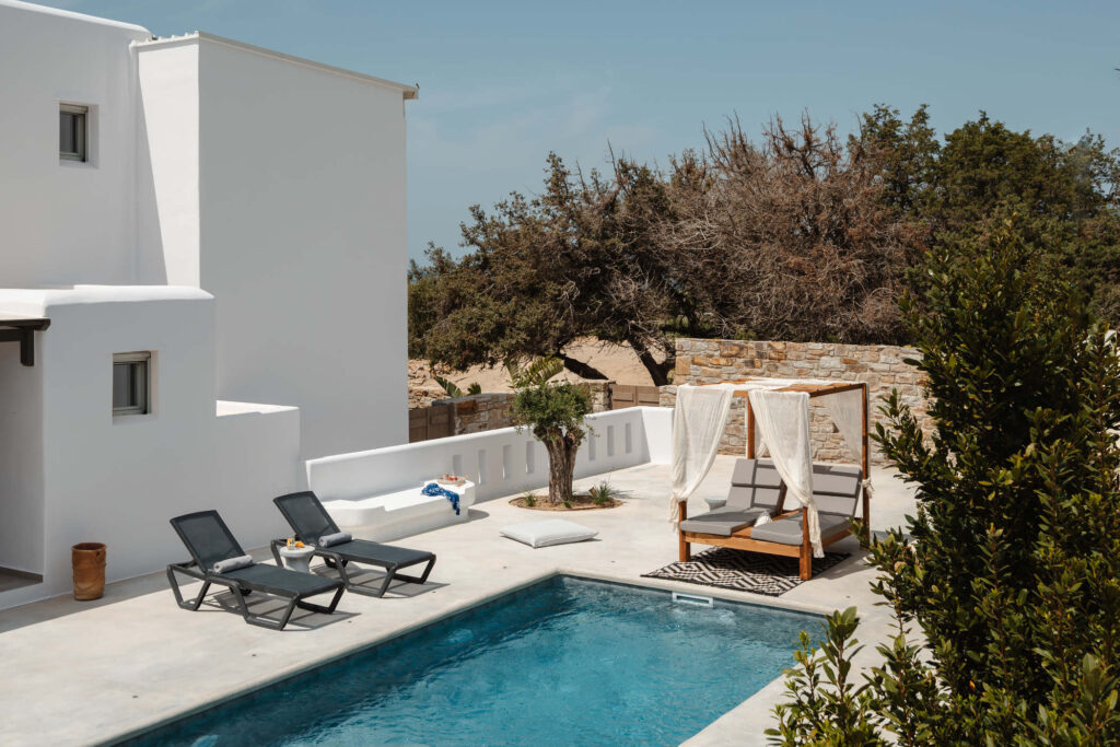 Welcome to a private sanctuary where nature and luxury intertwine! Nestled between golden sand dunes and a lush cedar forest, our 2-Bedroom Sea View Residence with Private Pool is designed to immerse you in the tranquility of Naxos. With 70 square meters of elegant interiors and 90 square meters of seamless indoor-outdoor living, this retreat is crafted for those who seek both comfort and connection to nature.